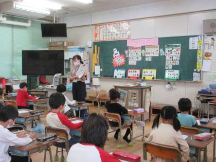 今日は,東成区の栄養教諭の先生に来ていただいて,1年生で栄養教育が行われました。