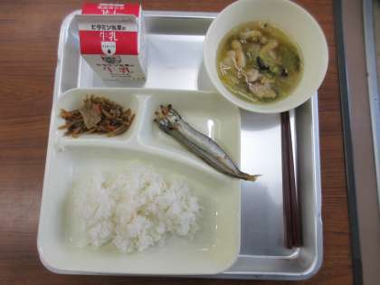 献立:焼きししゃも、五目汁、きんぴらごぼう、ごはん、牛乳