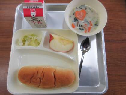 献立:きのこのクリームシチュー、キャベツのピクルス、りんご、パン、牛乳
