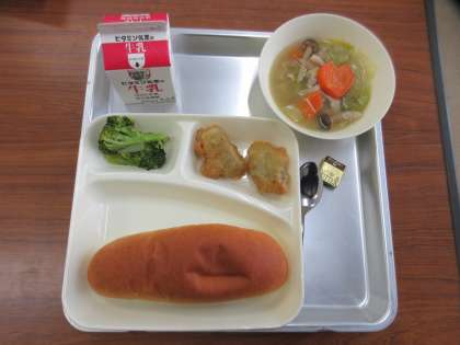 献立:白身魚のフリッター、洋風煮、ブロッコリーのサラダ、パン、バター、牛乳