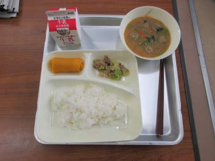 献立:豚肉とまいたけのいためもの、つみれ汁、かぼちゃういろう、ごはん、牛乳