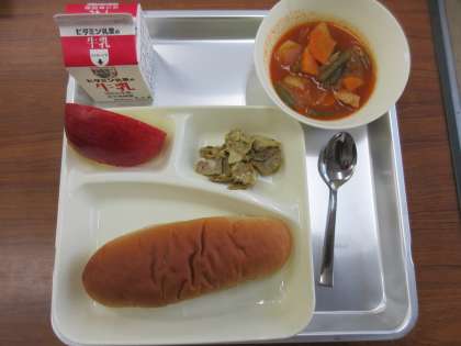 献立:豚肉のカレー風味焼き、ケチャップ煮、りんご、パン、牛乳