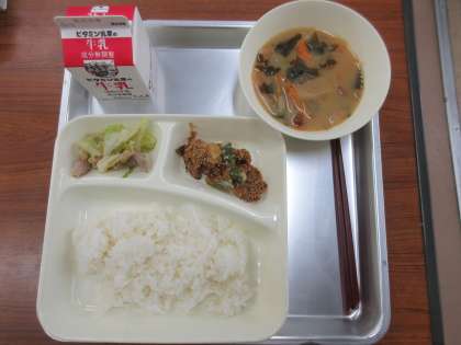 献立:鶏肉のごまだれ焼き、なめこのみそ汁、キャベツのいためもの、ごはん、牛乳