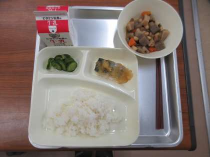 献立:さごしのおろしじょうゆかけ、大豆と冬野菜の煮もの、きゅうりのしょうがづけ、ごはん、牛乳