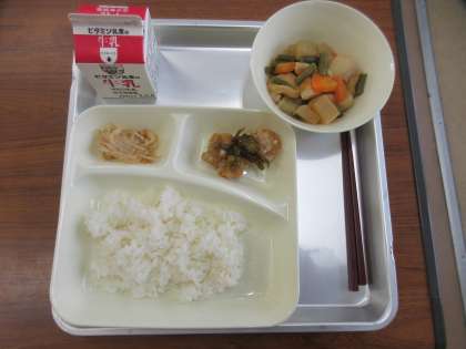 献立:あげどりのねぎだれかけ、含め煮、もやしのピリ辛あえ、ごはん、牛乳