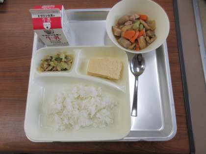 献立:卵どうふ、鶏肉と一口がんもの煮もの、野菜のそぼろいため、ごはん、牛乳