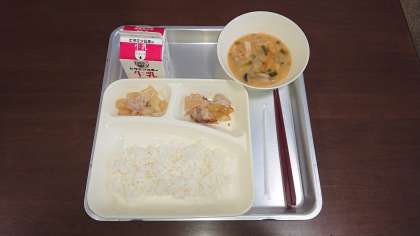 献立:鶏肉の甘辛焼き,みそ汁,大根の煮もの,ご飯,牛乳