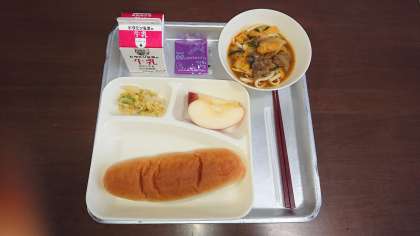 献立:カレーうどん,はくさいのおひたし,りんご,パン,牛乳