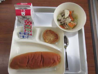 献立:とうふハンバーグ、カリフラワーのスープ煮、固形チーズ、パン、牛乳