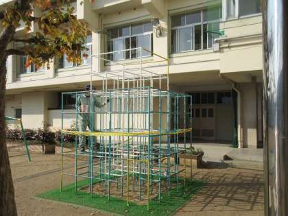 運動場のジャングルジムの塗料が剥げて、危険になっていました。管理作業員さんが塗料のはがれて危険なところを削り、新しい塗料を塗ってくださっています。いつも子どもたちの安全に気をつけてくださってありがとうございます。出来上がりが楽しみです。