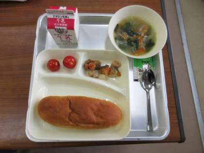 献立:さけのマリネ、肉だんごと麦のスープ、プチトマト、パン、ソフトマーガリン、牛乳