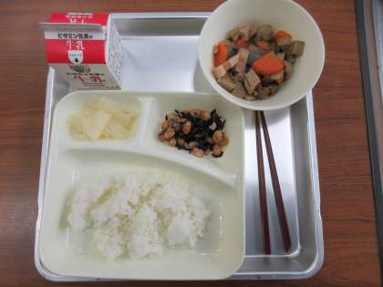 献立:筑前煮、ひじき豆、だいこんのゆず風味、ごはん、牛乳