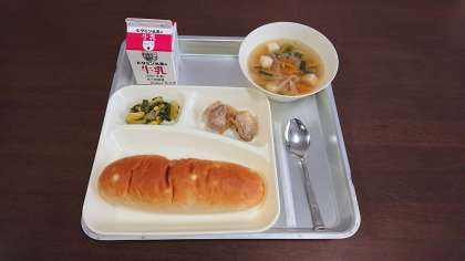 献立:鶏肉のオイスターソース焼き,中華スープ,チンゲンサイとコーンの中華あえ