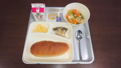 献立:あじのレモンマリネ,てぼ豆のスープ煮,固形チーズ,リンゴ缶,パン,牛乳