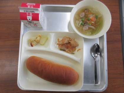 献立:鶏肉のバーベキューソテー、ウインナーとキャベツのスープ、焼きじゃが、パン、牛乳