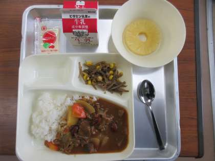 献立:牛肉(近江牛)と金時豆のカレーライス(ごはん)、ごぼうサラダ、パインアップル(缶)、牛乳