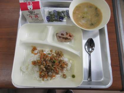 献立:鶏ごぼうご飯(ごはん)、みそ汁、焼きれんこん、牛乳