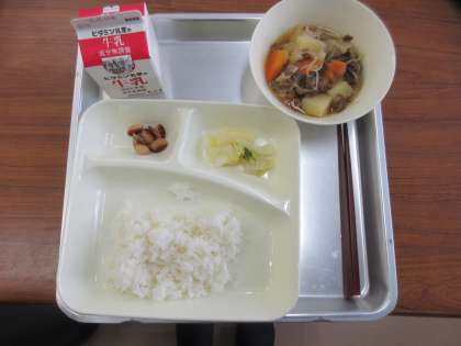 献立:肉じゃが、はくさいのゆず風味、とら豆の煮もの、ごはん、牛乳