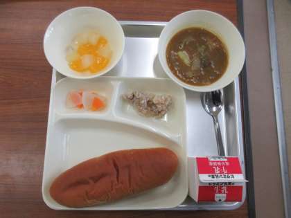 献立:フライドチキン、カレーシチュー(近江牛)、おいわいピクルス、フルーツゼリー、パン、牛乳
