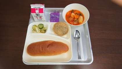 献立:チキンレバーカツ,ケチャップ煮,キャベツときゅうりのサラダ,パン,牛乳