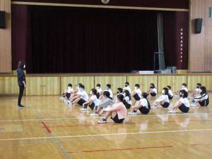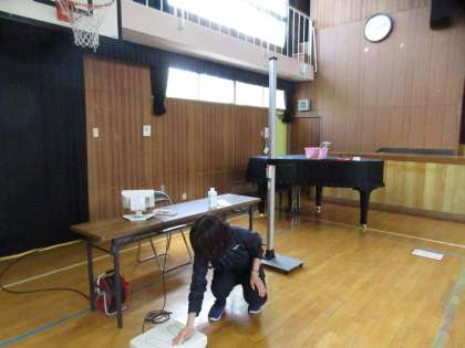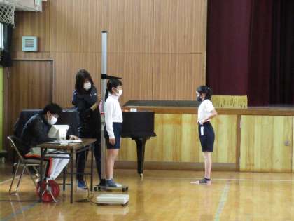 発育測定が始まりました。密を避けるために講堂を使っています。測定が終わったら身長系や体重計を消毒しています。
