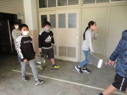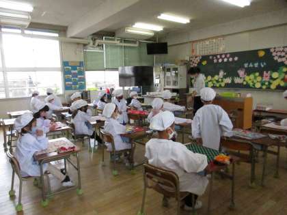 今日から給食が始まりました。全員エプロンをつけて給食の準備です。1年生は初めての小学校での給食です。はじめのうちは6年生が給食を運んでくれています。