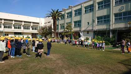 児童代表の歓迎の言葉の後、全校児童で「えがおいっぱい深江っこ」を手話をつけて聞き、深江小学校の校歌も聞きました。