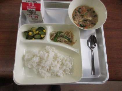 献立:マーボーどうふ、きゅうりとコーンの甘酢あえ、もやしとピーマンのごまいため、ごはん、牛乳