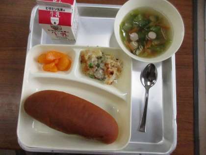 献立:マカロニグラタン、レタスのスープ、みかん(缶)、パン、牛乳