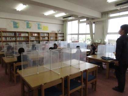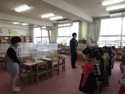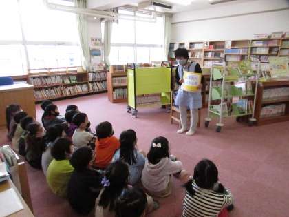 1年生は今日初めて図書館で学習をしました。図書館では読み聞かせや読書調べ学習をします。自分の席を確かめたり、補助員の吉田先生から図書館の使い方を教えていただきました。
