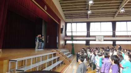 昨日の雨で運動場が使えないため、講堂で児童朝会を行いました。1月2月と工事のため講堂が使えなかったので、久しぶりの講堂での朝会でした。校長先生の話、短縄上級者の演技や委員会からの連絡と盛りだくさんでした。
