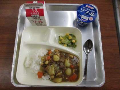 献立:牛肉と大豆のカレーライス(ごはん)、レタスとコーンのサラダ、ヨーグルト、牛乳