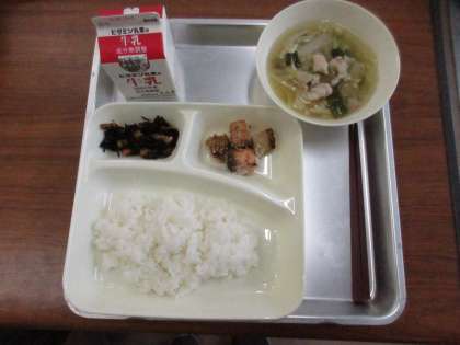 献立:さけのごまみそ焼き、五目汁、ひじきのいため煮、ごはん、牛乳