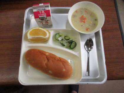 献立:コーンクリームシチュー、キャベツときゅうりのサラダ、かわちばんかん、パン、牛乳