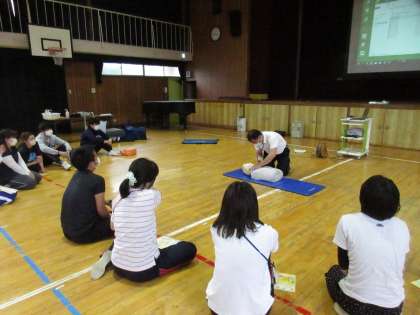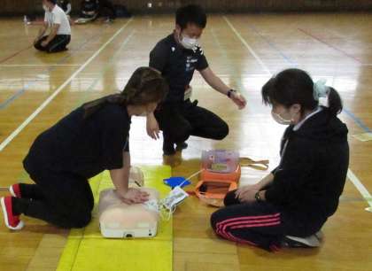 本日、本校講堂で救命法の講習会が行われました。消防署から救急講習の機材をお借りして、講話視聴・心臓マッサージ・AEDの実技等が行われました。本来であれば保護者の方々も参加していただくもですが、今年度は新型コロナウイルス感染症のため教職員だけで行われました。