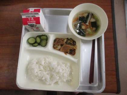 献立:ホイコウロー、中華スープ、きゅうりのピリ辛あえ、ごはん、牛乳