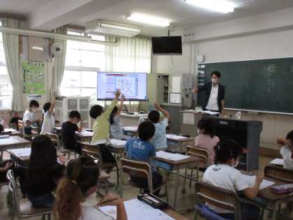 4年生の体育、5年生の英語、2年生の国語の学習の様子です。