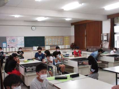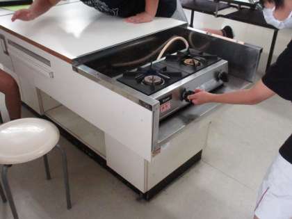 5年生の家庭科の学習の様子です。ガスコンロに火をつける練習をしています。