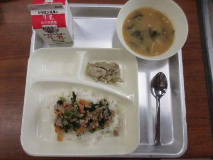 献立:豚ひき肉とにらのそぼろ丼(ごはん)、みそ汁、キャベツの赤じそあえ、牛乳