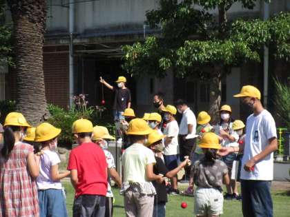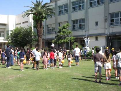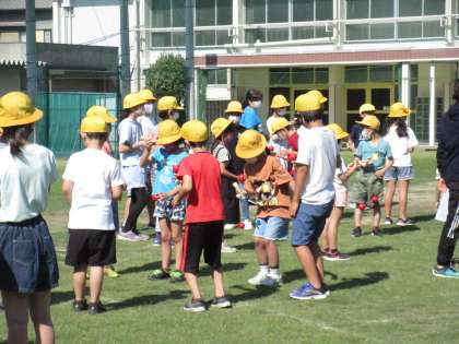 次に、けん玉委員会のけん玉集会が行われました。今日は1年生中心にけん玉の持ち方を習って、縦割り班で大皿に挑戦しました