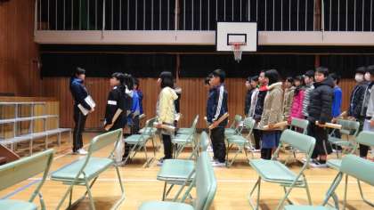 卒業式の予行を行いました。本番通りの9時半開始で10時50分ぐらいに終わりました。本番は、式辞や祝辞、謝辞などがあるので11時半近くになりそうです。