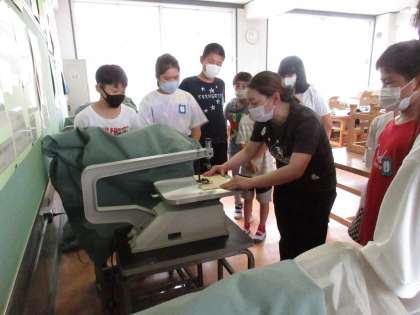 5年生の図画工作の学習の様子です。電動のこぎりを使って「マルチぜいたく伝言板」を作ります。今日は電動のこぎりの使い方を教えてもらいました。