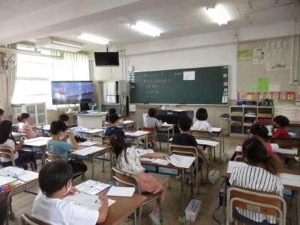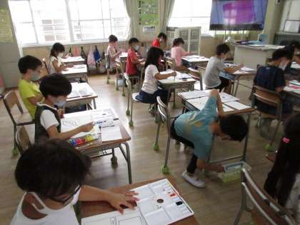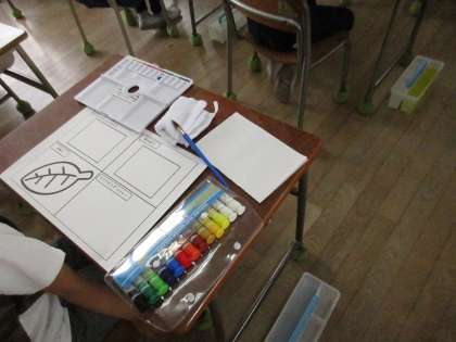 2年生の図画工作の学習のようすです。今日は初めての絵の具の学習です。用具の使いかたを教えてもらっていろいろな塗り方をしています。