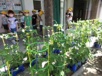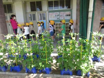 1年生が生活科で育てているあさがおが咲きました。つぼみもたくさんあります。これから楽しみですね。
