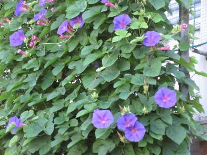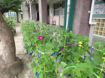 1年生の育てている「あさがお」、校庭の「りゅうきゅうあさがお」の花がきれいに咲いています。