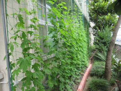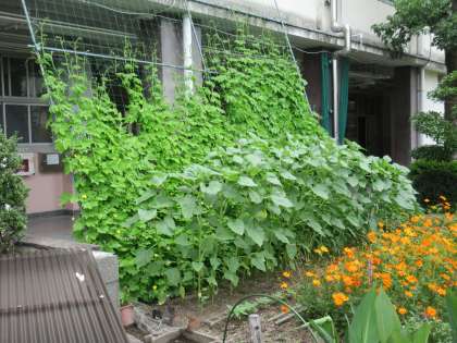 玄関前と東校舎裏で育ててもらっているゴーヤがすくすく育っています。