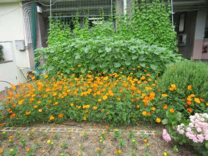 玄関前ではひまわりやコスモス、マリーゴールドもしっかりと育っています。