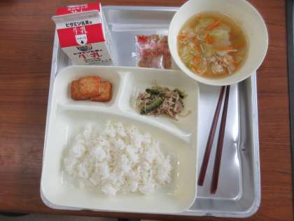 献立:ゴーヤチャンプルー、すまし汁、あつあげのしょうがじょうゆかけ、ごはん、牛乳