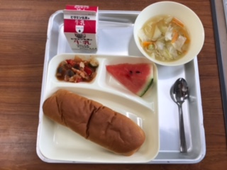 献立:鶏肉と夏野菜のソテー、押麦のスープ、すいか、パン、牛乳