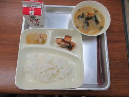 献立:さけのつけ焼き、みそ汁、とうがんの煮もの、ごはん、牛乳